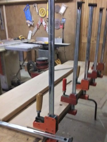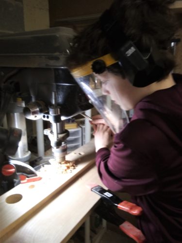 After some exciting gluing and clamping, we’re back to boring. The pun never gets old. Boring through one of the glued-up double side walls today. These guys are old hands at the drill press now. The low-speed drill does not warrant ear protection, but occasionally the forstner bit loses clearance and squeals like a pig stuck under a gate or a dog with his tail caught in the car door. I don’t know where the boys get these expressions or how they know that sound. Anyway, they hate it and the threat of it is the reason for the earmuffs.