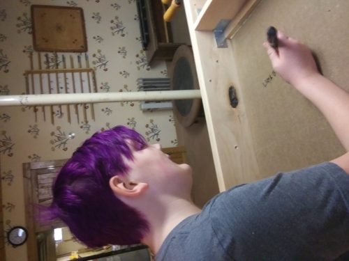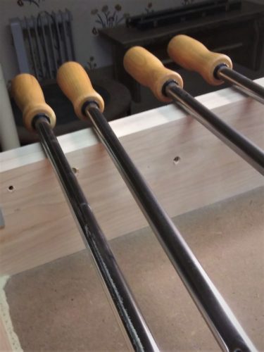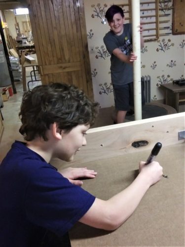 We finished four of the handles and attached them to the tubes. I keep the boys separate from the chemical side of woodworking, but I thought I’d mention that the polyurethane type Gorilla glue works well for this sort of thing. The wood handles and steel shafts are eternally united. We’re working on the underbelly of the table today, reinforcing the playing field and while it’s upside down, we’re signing it. It’s a tradition.