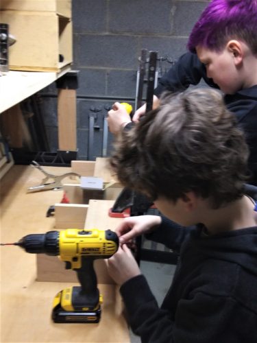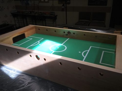 The boys are doing more familiar work today, driving in screws, assembling the ball-return compartments that fit under the table. They’re very good at this.