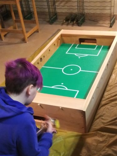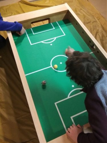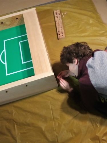 We’re conducting a test to see if we need a mesh net on the ball return outlets to retain the balls after a goal, or if they might rebound out. Looks like the mesh may be needed. Fortunately, we have an in-house designer for such things. Also, we’re teamed-up and working on the penultimate control rod handle.
