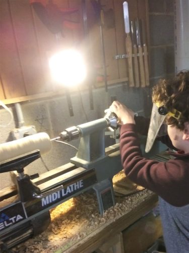 The boys enjoyed making the countersink plugs and now they’re tapping some in. Good times. For those keeping score, I’ll flush trim the end-grain overhang of the side boards using a two-flute down-cut spiral router bit. A task not yet for the boys…