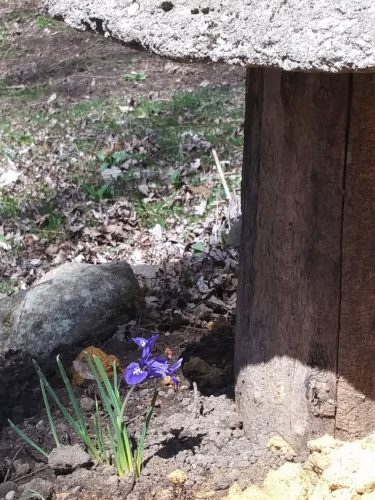 The first thing to pop in our new mushroom garden was this. Even I know it isn’t a mushroom. The resident gardener says, “No, that’s a stray Dwarf Iris Reticulata!”