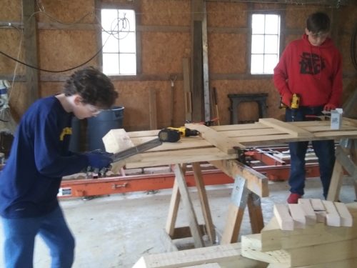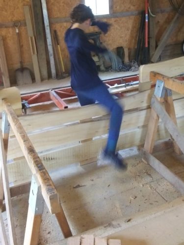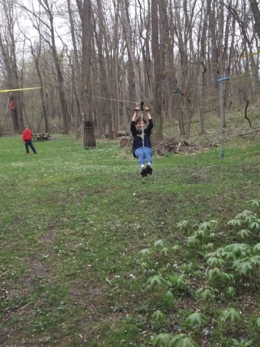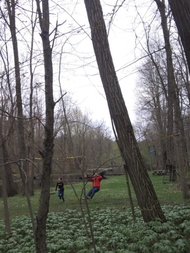 We’re back working on it, making the entrance panel and trying it out… And we had time to install the zipline coaster for the season. First, we had Grammie test it. She declared it safe and fit for grandkid use…