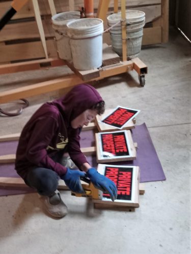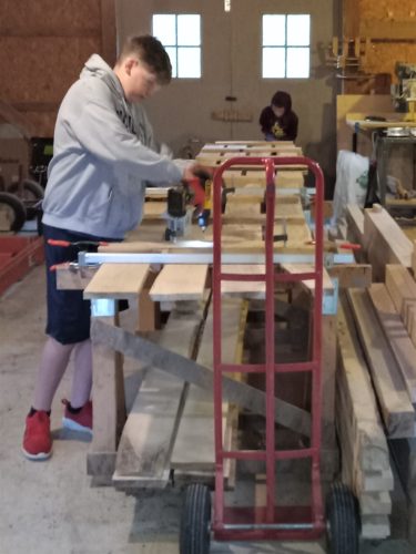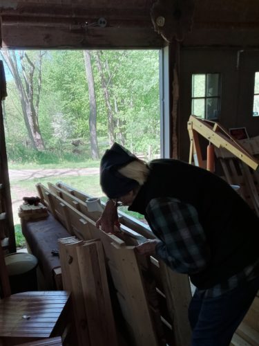 It’s like a GaGa Pit assembly line in the mill now. The crew has raised a concern about slivers once we put this thing together and start using it, so, we recruited the one with finer fine motor skills to cover the wall top edges. Also, we’re mastering the mechanical staple gun today…