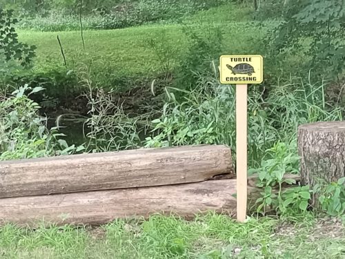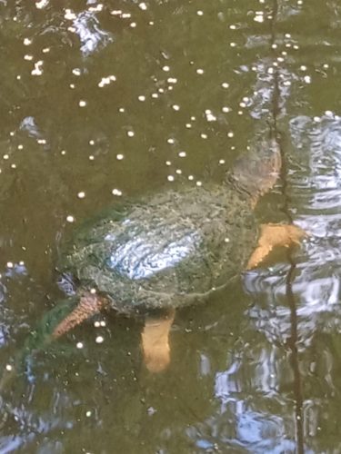 TurtlesWe have now six size XL snappers thriving in our pond, including the matriarch, Bertha, and this shaggy tailed male we call, Trouble. We added a sign today…