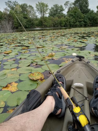 Not a bad day for kayak fishing in the ponds of Four Mile Lake. Very good, in fact. We caught Fish. That’s what we named him before we set him free…